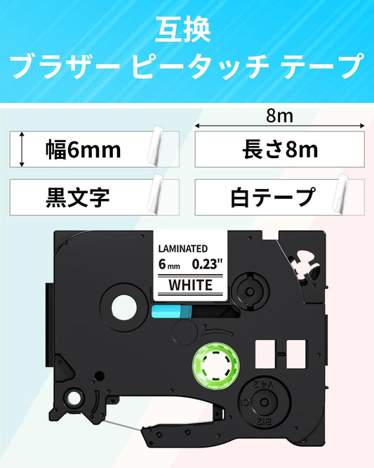 ピータッチ ラミネートテープ TZe-211 幅6mm 白地黒文字 5個 互換 ブラザー ラベルライター テープ 長さ8m